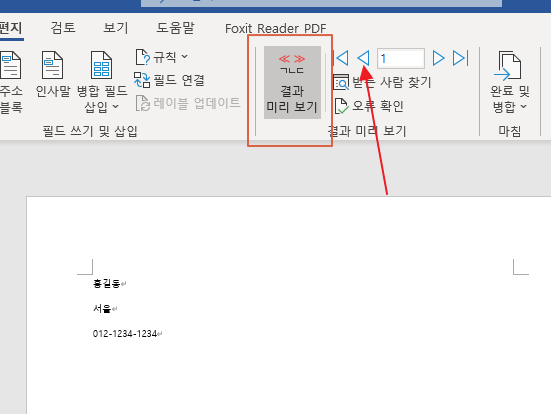 그럼 병합필드 삽입 항목으로 엑셀에 있는 아래 처럼 항목이 보인다.