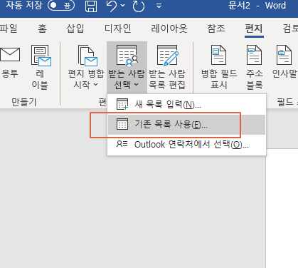 "편지" 라는 탭에서 >>"받는 사람 선택" >> "기존 목록 사용" 을 선택하고