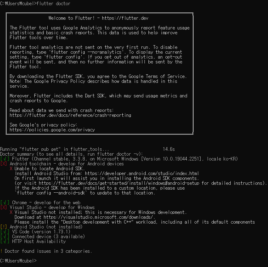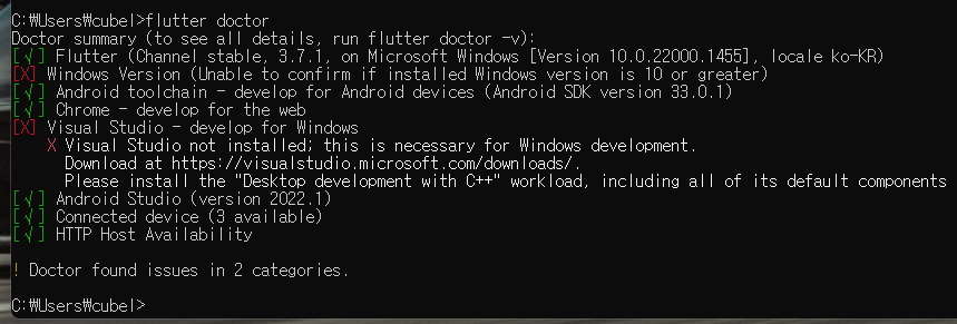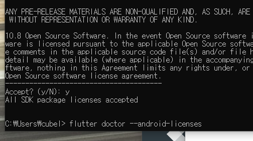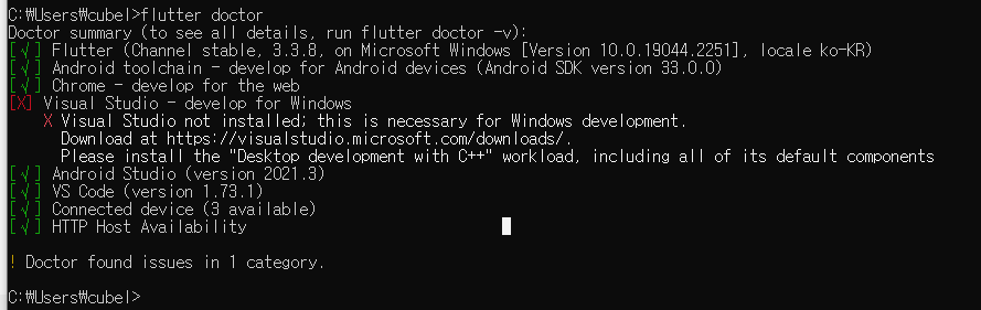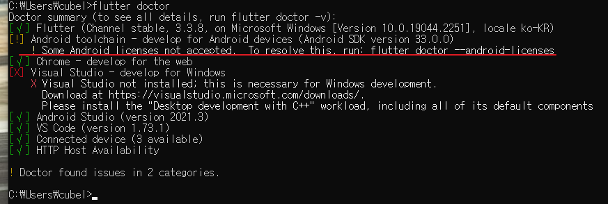설치 완료후 다시 #> flutter doctor 실행 하니 경고가 하나 있어서 , 이것도 실행