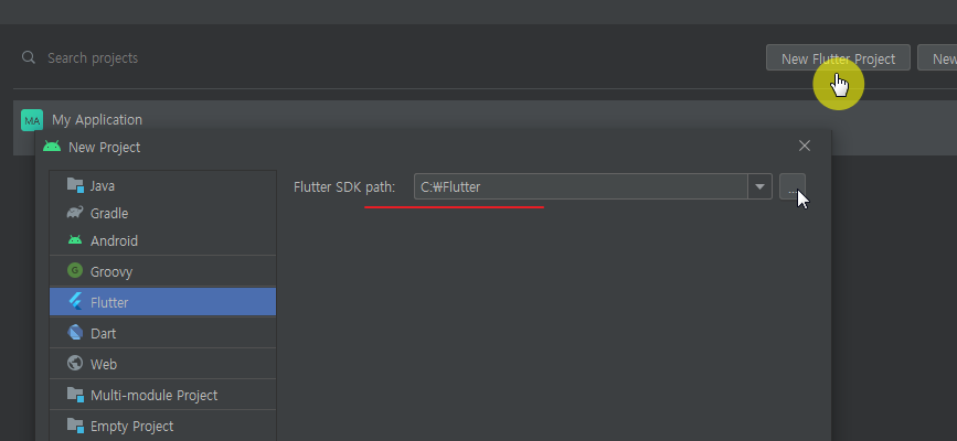 이제 플러터 프로젝트 생성 버튼을 눌러서 Flutter SDK 폴더를 지정해 줘야한다.