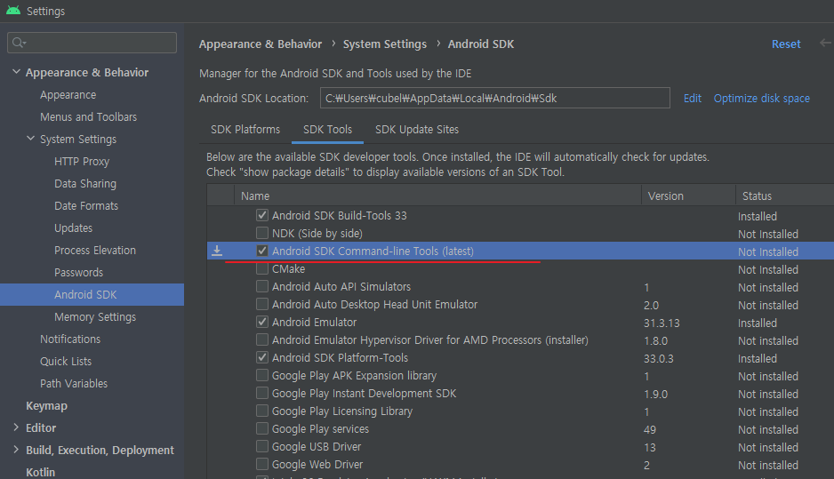 다음 화면에서 상단 탭 "SDK Tools" 에서 커맨드 라인툴 선택하고 설치 진행