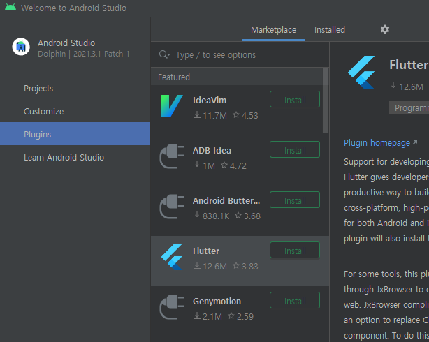 그리고 이제 안드로이드 스튜디오에서 플러터 개발을 하기 위한 플러그인 설치